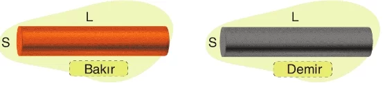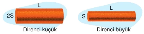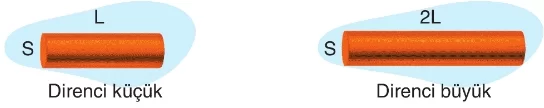 - Aşağıdaki aynı cins ve eşit kalınlıktaki çubuklardan uzunluğu fazla olanın direnci büyüktür.