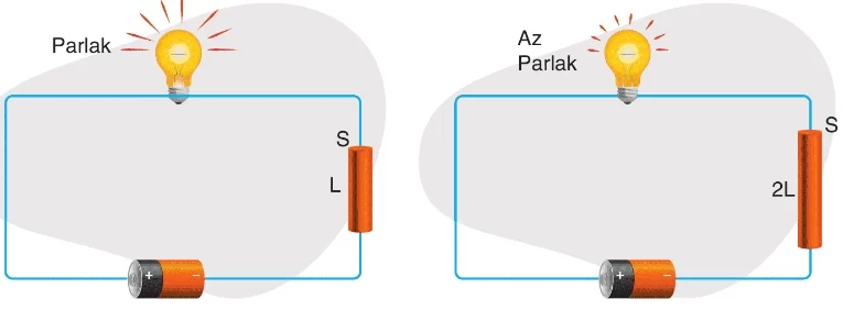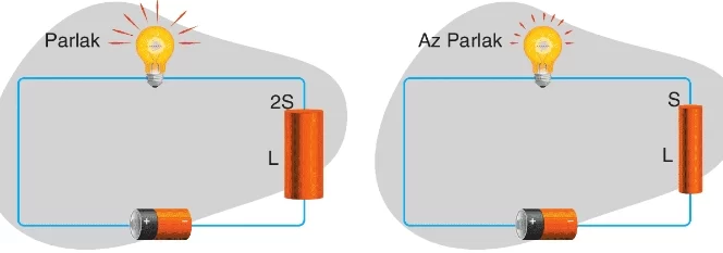 İletkenin uzunluğu arttıkça direnci artar (doğru orantı). K teli daha uzun olduğu için $R_K > R_L$ olur. Direnci küçük olan devredeki ampul daha parlak yanacağı için L devresindeki ampul daha parlak yanar.