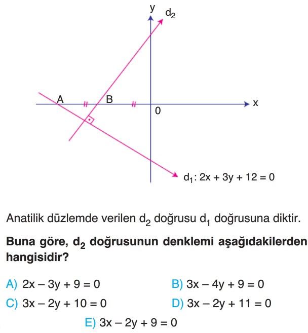 Soru: Analitik düzlemde, y = 2x — 3 doğrusu ile y ekseni üzerinde dik kesişen doğrunun denklemi aşağıdakilerden hangisidir?