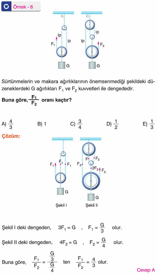 Çözüm: Kuvvet kazancı = yük / kuvvet olduğundan, kazanç = 200 N / 50 N = 4’tür.