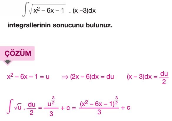 Çözüm: x2 - 3x - 5 = u dersek (2x-3).dx = du olur. Buradan u.du nun integrali u2/2 + c dir. U yu yerine yazarsak işlemin sonucu (x2 - 3x - 5)2 bölü 2 + c olarak bulunur.