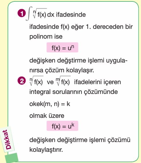 Daha önce gördüğümüz özelliklerle integrali kolayca alınamayan bazı ifadeleri, değişken değiştirme yöntemi kullanarak bulabiliriz. Ancak daha önce şunu bir hatırlayalım: