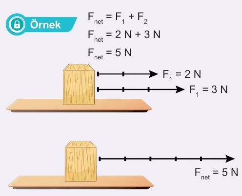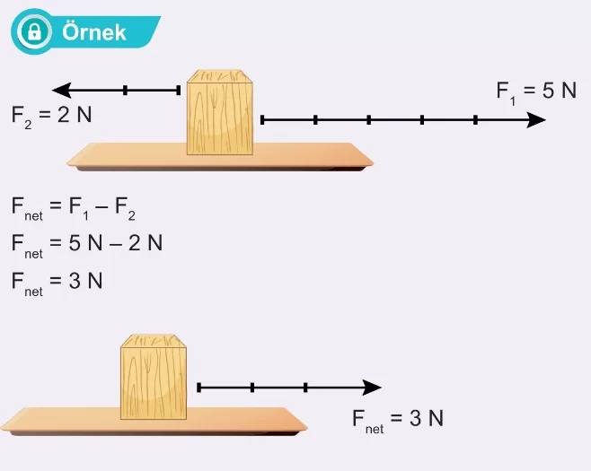 Büyüklük: $F_{\text{net}} = 12 \text{ N} – 5 \text{ N} = 7 \text{ N}$.
