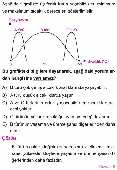 Örnek: A, B ve C bakteri türleri bir petri kabındaki besi ortamında gelişmeye bırakılmış, bir süre sonra bu kaba belirli aralıklarla ve dozları artırarak antibiyotik uygulanmıştır. Dozlar uygulandıktan sonra canlı kalan birey sayıları aşağıdaki grafiklerde gösterilmiştir. Grafiklerdeki bilgilere göre aşağıdaki yorumlardan