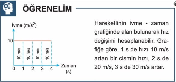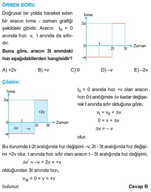 Çözüm: İvme, hız değişiminin zamana oranıdır. a = (v – v0) / t . Burada v0 = 0 , v = 16 , t = 4 . İvme a = 16 / 4 = 4 m/s² ‘dir.