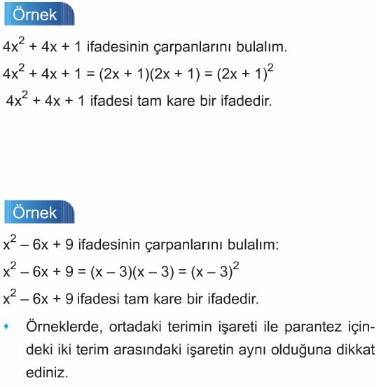 a2 – b2 biçimindeki ifadeleri çarpanlarına ayırmak için birinci ve ikinci terimin karekökü alınır. Bulunan terimler, toplamları ile farklarının çarpımı biçiminde yazılır.