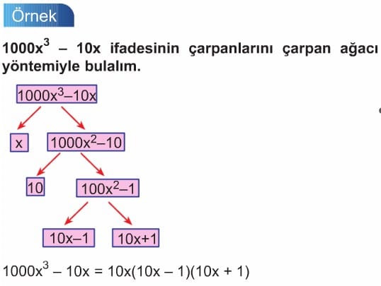 Buna göre, bir ifadeyi çarpanlarına ayırmak demek; ifadeyi iki terimli veya daha çok terimli ifadelerin çarpımı şeklinde yazmak demektir.