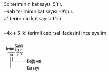 Cebirsel ifadede bir sayı ile değişkenin veya birden fazla değişkenin çarpımına terim denir. Yanında değişken olmayan terim, sabit terim olarak adlandırılır. Terimlerin sayısal çarpanı ise kat sayı olarak adlandırılır.