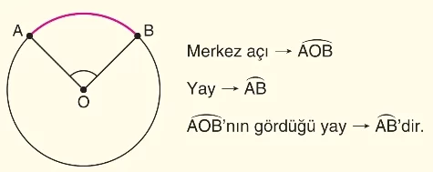 - Köşesi çemberin merkezinde olan açıya merkez açı ve bu açının iç bölgesinde (kolları arasında) kalan yaya da merkez açının gördüğü yay denir.