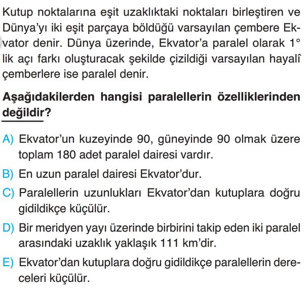 Soru: Kutup noktalarını birleştirdiği varsayılan, paralelleri dik kesen yarım çemberlere meridyen denir. Aşağıdakilerden hangisi meridyenlerin özelliklerinden değildir?