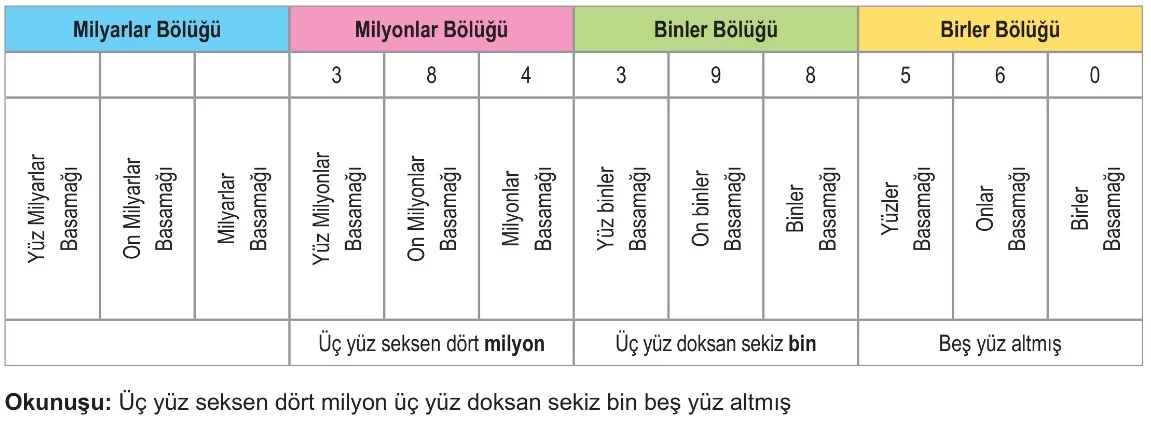 - Okunuşu verilen doğal sayıları yazmak için soldan sağa doğru sırasıyla milyarlar, milyonlar, binler ve birler bölüğündeki sayılar yan yana yazılır.