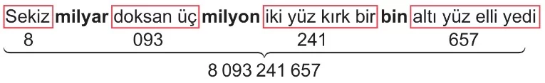 Örnek: Dünya nüfusu günümüzde “Sekiz milyar doksan üç milyon iki yüz kırk bir bin altı yüz elli yedi”dir.