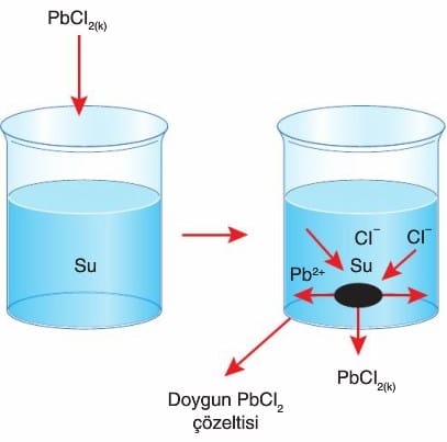 - Yukarıdaki şekilde saf su bulunan kaba sabit sıcaklıkta, sudaki çözünürlüğü endotermik olan PbCl2 katısı atılınca zamanla çözünme gerçekleşir ve çözelti doyar.