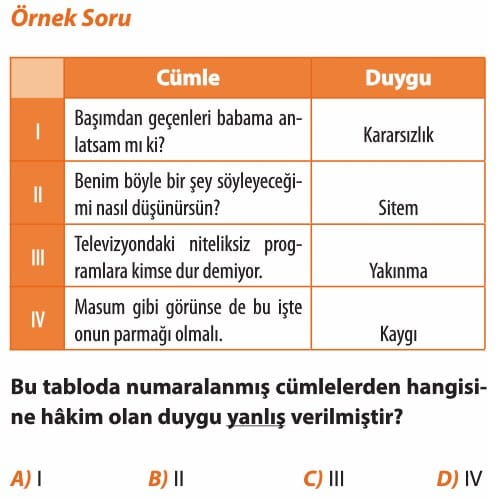 Örnek Soru: Aşağıdaki cümlelerden hangisine hâkim olan duygu yay ayraç içinde yanlış verilmiştir?