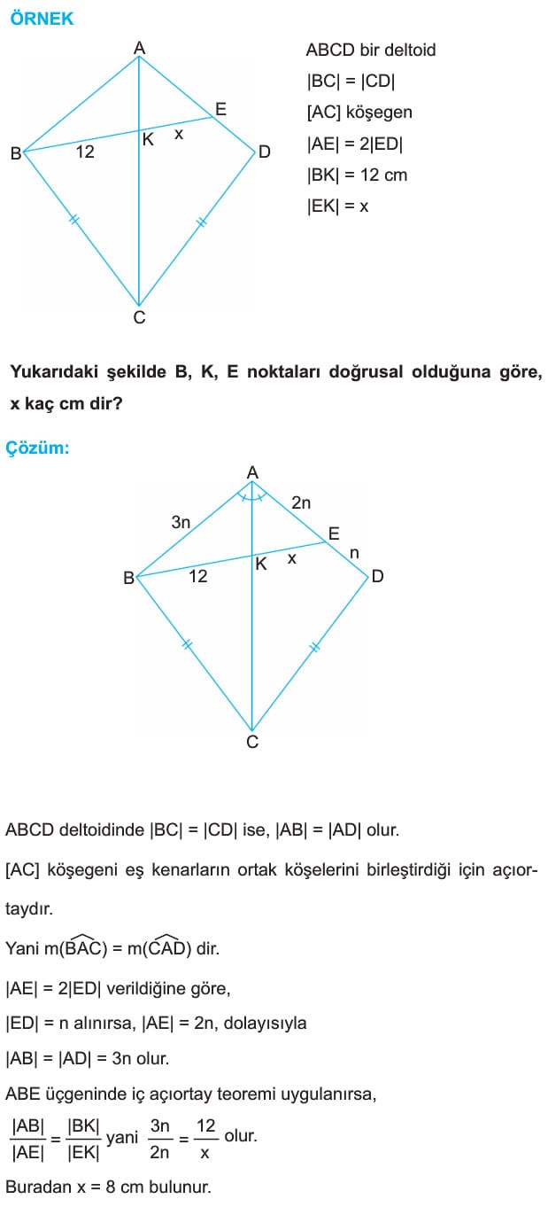 Çözüm: ABCD deltoidinde |AB| = |BC| ise, |AD| = |DC| dir. Eş olmayan kenarların oluşturduğu açılar eş olduğundan,