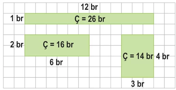 Örnek: Aşağıda alanları 12 br² olan farklı dikdörtgenlerin çevre uzunluklarını bulalım.