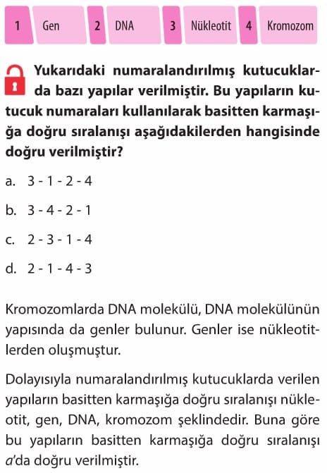 Kromozomlarda DNA molekülü, DNA molekülünün yapısında da genler bulunur. Genler ise nükleotitlerden oluşmuştur. Dolayısıyla numaralandırılmış kutucuklarda verilen yapıların basitten karmaşığa doğru sıralanışı nükleotit, gen, DNA, kromozom şeklindedir. Buna göre bu yapıların basitten karmaşığa doğru sıralanışı a'da doğru verilmiştir.