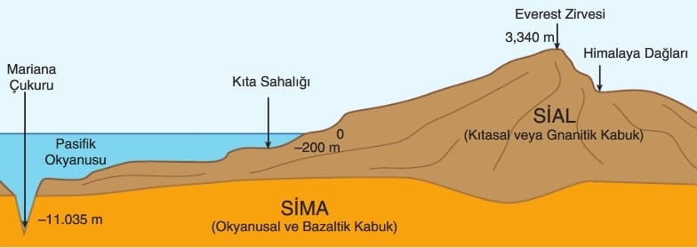 Örneğin sial katmanı Himalaya Dağlarının altında en fazla kalınlığa ulaşırken, Pasifik Okyanusu’nda Mariana Çukurluğu gibi okyanus hendeklerinde tamamen ortadan kalkmaktadır.