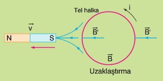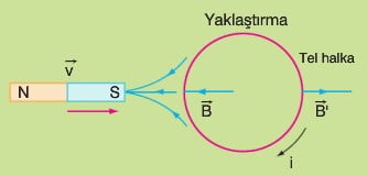 Mıknatıs v sabit hızla yaklaştığında, tel halkadan geçen B manyetik alanı artar, buna karşın tel halkada ok yönünde indüksiyon akımı oluşarak B ye karşı, B’ manyetik alanını oluşturur.