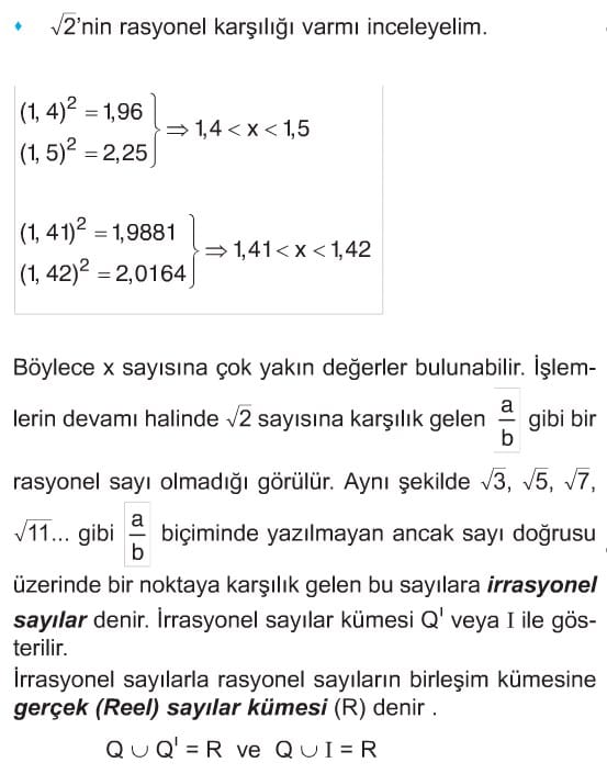Tanım: Tamamı kök dışına alınamayan sayılar İrrasyonel sayılardır. Böylece x sayısına çok yakın değerler bulunabilir. İşlemlerin devamı halinde sayısına karşılık gelen gibi bir rasyonel sayı olmadığı görülür. Aynı şekilde gibi biçiminde yazılmayan ancak sayı doğrusu üzerinde bir noktaya karşılık gelen bu sayılara İrrasyonel sayılar denir. İrrasyonel sayılar kümesi Q' ile gösterilir. İrrasyonel sayılarla rasyonel sayıların birleşim kümesine gerçek (Reel) sayılar kümesi (R) denir .