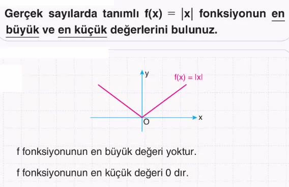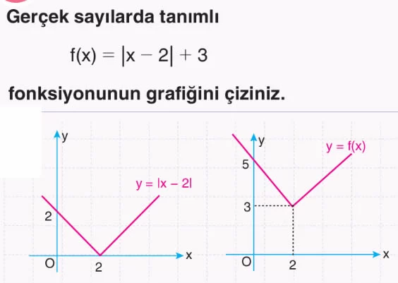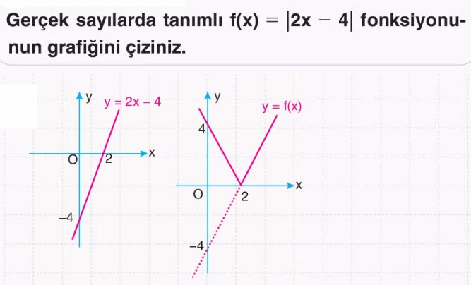 Dikkat: Gerçek sayılarda tanımlı |f(x)| fonksiyonunun grafiği çizilirken önce f fonksiyonunun grafiği çizilir. Daha sonra f fonksiyonunun işaretinin negatif olduğu kısım x eksenine göre yansıması alınarak |f(x)|’in grafiği çizilmiş olur.