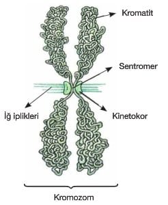 Bir kromozomda 2 kinetokor boğumu ve 1 sentromer bulunur. Kinetokorlar, iğ ipliklerinin bağlandığı protein yapılı moleküllerdir.