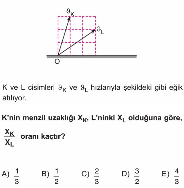 Soru: Eşit büyüklükteki hızlarla şekildeki gibi atılan K ve L cisimlerinin menzil uzaklıkları eşittir. Buna göre, K ve L hızlarının arasındaki alfa açısı kaç derecedir?