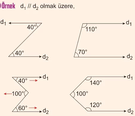 - Sorulan açı, kesenin sağ tarafındaki diğer iç açıdır. Bu açı ile iç tersi olan açı, aynı doğru üzerinde birbirine komşu oldukları için Karşı Durumlu Açı çiftini oluştururlar. (Veya kesişim noktasındaki ‘lik açının komşusu olan açı, doğru açıdan () bulunur, bu da istenen açıdır.)