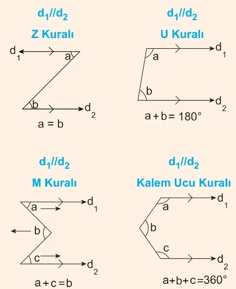 Soru: Şekilde dir. Bu iki paralel doğru arasında oluşan açılardan, sola bakan açıların toplamı sağa bakan açıya eşittir (M Kuralı olarak da bilinir). doğrusundan aşağıya doğru ‘lik bir açı ve doğrusundan yukarıya doğru ‘lik bir açı sola bakmaktadır. Bu iki açının arasında, sağa bakan açısı oluşmaktadır. Buna göre kaç derecedir?