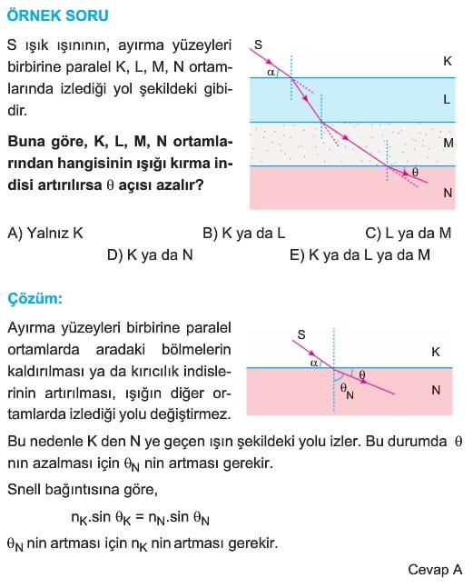 Çözüm: Snell Yasası’na göre, ışığın kırılma açısı, ortamların kırılma indislerine ve ışığın geliş açısına bağlıdır.