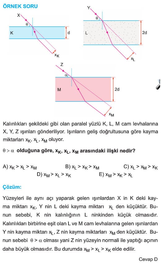Çözüm: Işık, yoğun bir ortamdan (cam) daha az yoğun bir ortama (hava) geçerken normale göre uzaklaşır.