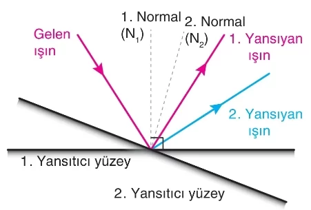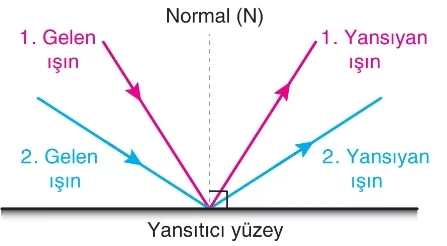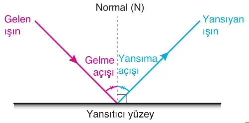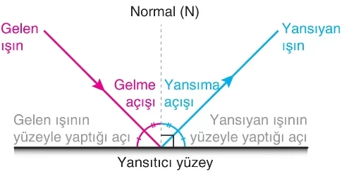 - Gelen ve yansıyan ışınların yansıtıcı yüzeye değdiği noktada, yüzeye dik olacak şekilde çizilen hayali dik çizgiye yüzeyin normali denir. Normal, N harfi ile gösterilir ve gelme ve yansıma açılarını ölçmek için kullanılır.