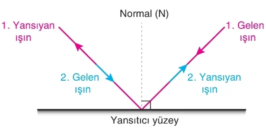 - Bir yüzeye normal doğrultusunda yani yüzeye dik gelen ışınlar kendi üzerlerinden geri yansırlar.