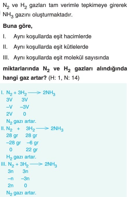 Gazlar için aynı koşullarda hacim ile mol sayısı doğru orantılıdır. Eşit mol ya da hacimli soru tiplerinde tepkimeye giren maddelerin katsayısı büyük olan sınırlayan maddedir.