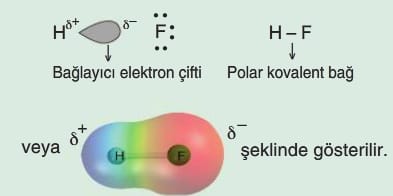 Farklı ametallerin elektronegatiflikleri farklı olduğu için molekülde (+) ve (—) kutuplanmalar olur. Elektronegatifliği büyük olan, elektronları daha çok çektiğinden kısmi negatif (8–), diğer atom ise kısmi pozitif (8+) yükle yüklenir. Böylece kalıcı dipoller (iki kutup) oluşur. Bu şekilde oluşan bağlara polar (kutuplu) kovalent bağ denir.