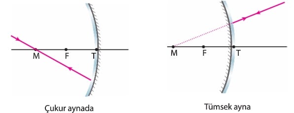 * Çukur aynada asal eksene paralel gelen ışınlar, odak noktasından geçecek şekilde yansır. Tümsek aynada asal eksene paralel gelen ışınlar, uzantısı odak noktasından geçecek şekilde yansır.