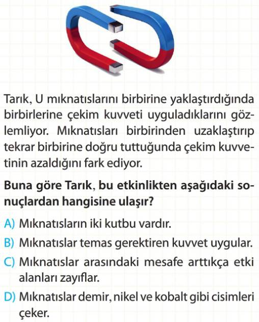 Soru: Tarık, U mıknatıslarını birbirine yaklaştırdığında birbirlerine çekim kuvveti uyguladıklarını gözlemliyor. Mıknatısları birbirinden uzaklaştırıp tekrar birbirine doğru tuttuğunda çekim kuvvetinin azaldığını fark ediyor.