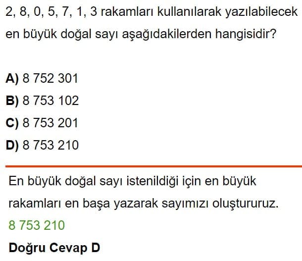 Soru: 4, 8, 6, 5, 7, 3 rakamlarını birer defa kullanarak yazılabilecek en büyük sayının okunuşu aşağıdakilerden hangisinde doğru olarak verilmiştir?