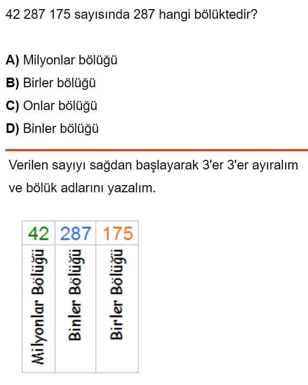 Bölük: Basamaklar belirli gruplara ayrılarak daha büyük sayıların okunmasını ve işlenmesini kolaylaştırır. Her üç basamak bir bölüğü temsil eder. Bu bölükler sırasıyla birlikler, onluklar, yüzler, binlikler, on binlikler vb. olabilir. Örneğin, 45,678 sayısında 45 birlikler bölüğünü, 6 onluklar bölüğünü, 7 yüzler bölüğünü ve 8 binlikler bölüğünü temsil eder.