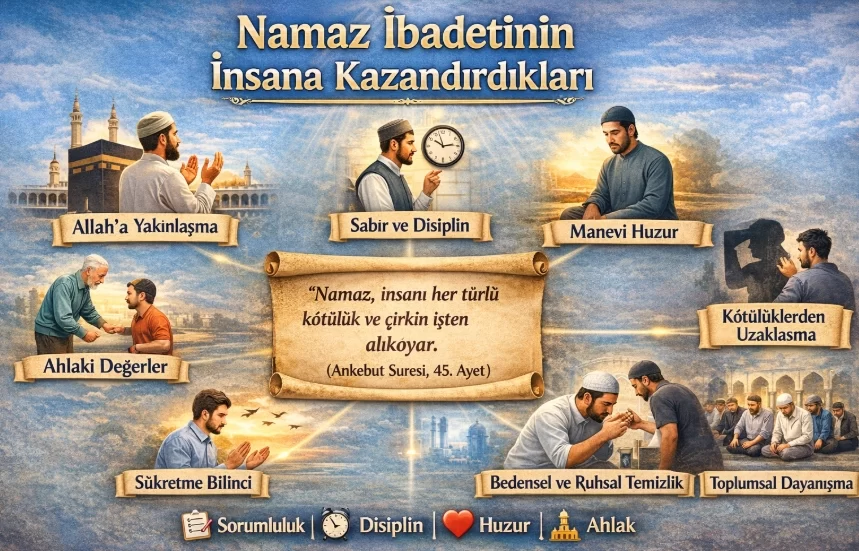 - Namaz, sabır, tevazu, saygı ve dürüstlük gibi ahlaki değerleri geliştirir. Namaz kılan insan, başkalarına karşı daha sabırlı, saygılı ve adil olmaya özen gösterir. Namaz, insana Allah’a karşı olduğu kadar insanlara karşı da sorumluluk bilinci kazandırır.