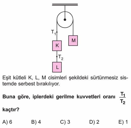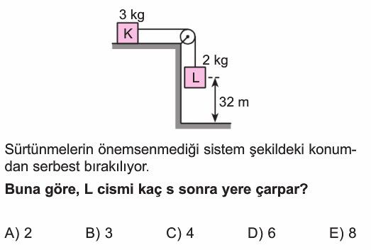 Çözüm: Newton’un I. yasasına göre, cisim üzerine net kuvvet etki etmiyorsa ya durmaya devam eder ya da sabit hızla hareket eder. Sabit hızla hareket eden bir araba, eylemsizlik durumunu sürdürür. Doğru cevap: A)