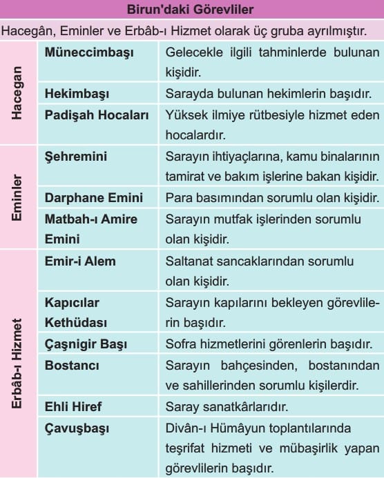 Topkapı Sarayı; padişahın hizmetkârlarının bulunduğu enderun (iç saray), birun (dış saray) ile padişahın özel hayatını geçirdiği harem (darüssaade) olmak üzere üç bölümden oluşmuştur.
