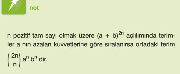 r = n – p + 1‘dir.Örneğin, (a+b)¹⁰ açılımında a’nın azalan kuvvetlerine sıralama yapıldığında sondan 4. terim için: