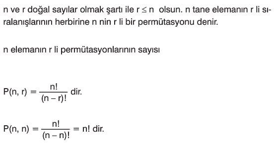 - Herhangi bir elemanın bulunduğu r li permütasyonların sayısı soruluyorsa tüm durumlardan o elemanın bulunmadığı durumlar çıkarılır.