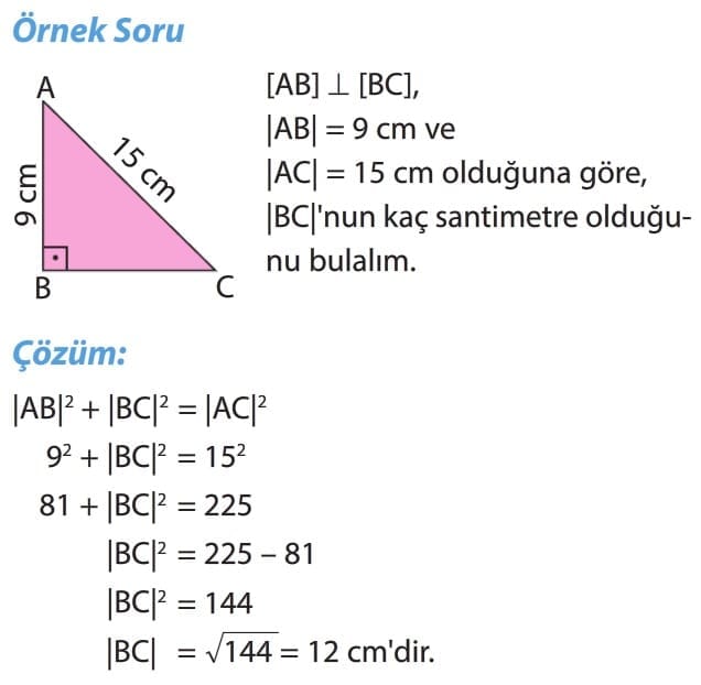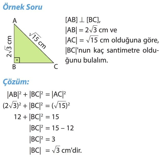 Çözüm: Direğin boyu 8 metre ve 3 metre yukarıdan kırıldığında |AC| = 8 - 3 = 5 metre olur. ABC üçgeninde pisagor bağıntısını uyguladığımızda 52 = 32 + |BC|2 denklemi çözülürse |BC| = 4 metre olarak bulunur.