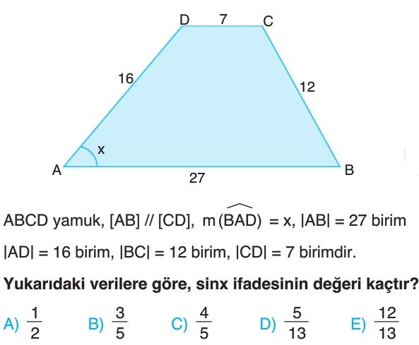 11. Sınıf Trigonometrik Fonksiyonların Geometrik Şekillerde Uygulanması Test 1