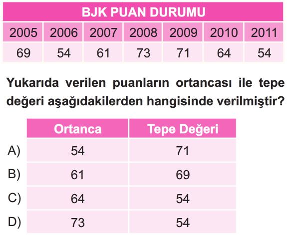 7. Sınıf Aritmetik Ortalama, Ortanca, Tepe Değer Test 5
