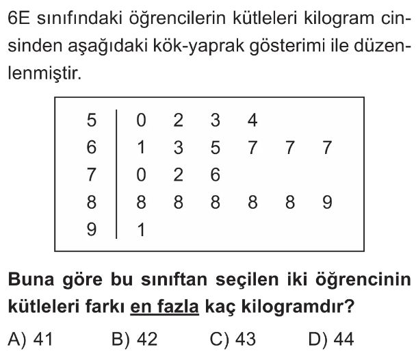 6. Sınıf Veri Görselleştirme ve Özetleme (Kök Yaprak Gösterimi) Test 1