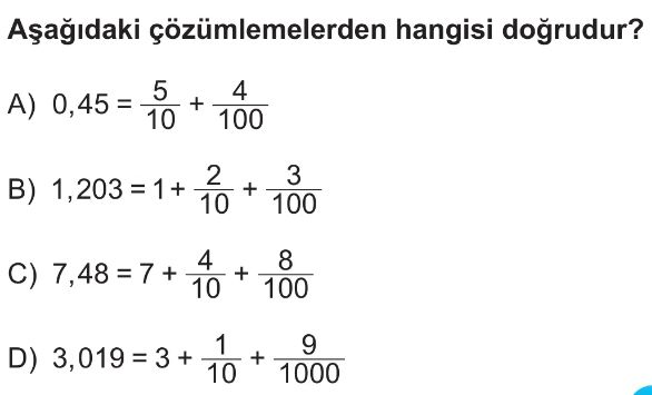 6. Sınıf Ondalık Gösterimlerde Basamak Değeri ve Çözümleme Test 1