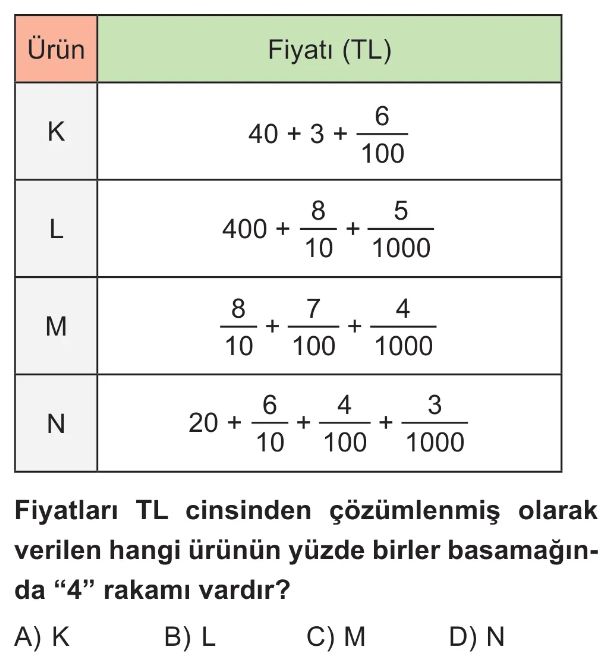 6. Sınıf Ondalık Gösterimlerde Basamak Değeri ve Çözümleme Test 6